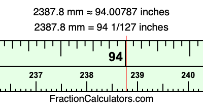 One millimeter is equal to 5/127 inches, and 2387.8 as a fraction is 11939/5. Therefore, to get the fractional answer to 2387.8 mm in inches, we multiply 11939/5 by 5/127 and simplify if necessary.