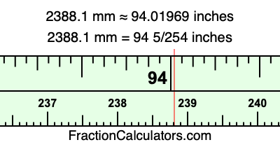 One millimeter is equal to 5/127 inches, and 2388.1 as a fraction is 23881/10. Therefore, to get the fractional answer to 2388.1 mm in inches, we multiply 23881/10 by 5/127 and simplify if necessary.