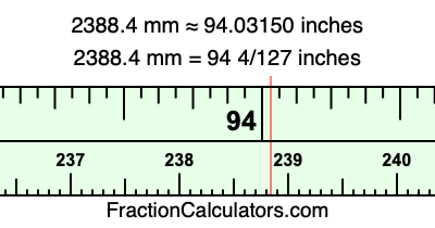 One millimeter is equal to 5/127 inches, and 2388.4 as a fraction is 11942/5. Therefore, to get the fractional answer to 2388.4 mm in inches, we multiply 11942/5 by 5/127 and simplify if necessary.