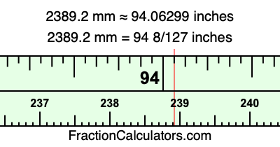 One millimeter is equal to 5/127 inches, and 2389.2 as a fraction is 11946/5. Therefore, to get the fractional answer to 2389.2 mm in inches, we multiply 11946/5 by 5/127 and simplify if necessary.