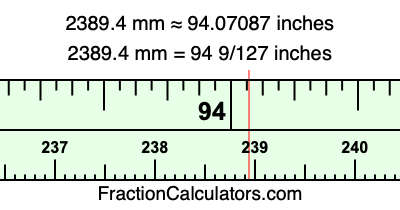 One millimeter is equal to 5/127 inches, and 2389.4 as a fraction is 11947/5. Therefore, to get the fractional answer to 2389.4 mm in inches, we multiply 11947/5 by 5/127 and simplify if necessary.