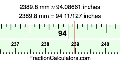 One millimeter is equal to 5/127 inches, and 2389.8 as a fraction is 11949/5. Therefore, to get the fractional answer to 2389.8 mm in inches, we multiply 11949/5 by 5/127 and simplify if necessary.