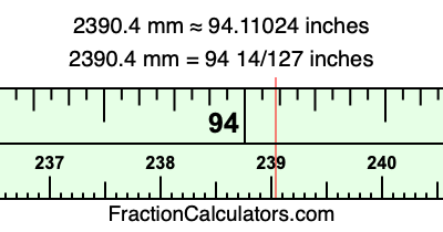 Here is how to convert 2390.4 mm to inches. We will give you the fractional answer, the decimal answer, and illustrate the answer on our tape measure.