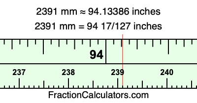 One millimeter is equal to 5/127 inches, and 2391 as a fraction is 2391/1. Therefore, to get the fractional answer to 2391 mm in inches, we multiply 2391/1 by 5/127 and simplify if necessary.