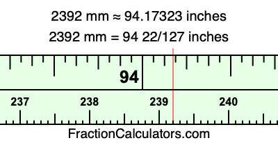 One millimeter is equal to 5/127 inches, and 2392 as a fraction is 2392/1. Therefore, to get the fractional answer to 2392 mm in inches, we multiply 2392/1 by 5/127 and simplify if necessary.