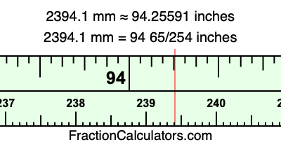 One millimeter is equal to 5/127 inches, and 2394.1 as a fraction is 23941/10. Therefore, to get the fractional answer to 2394.1 mm in inches, we multiply 23941/10 by 5/127 and simplify if necessary.
