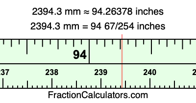 One millimeter is equal to 5/127 inches, and 2394.3 as a fraction is 23943/10. Therefore, to get the fractional answer to 2394.3 mm in inches, we multiply 23943/10 by 5/127 and simplify if necessary.