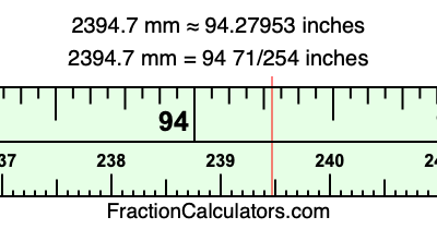 One millimeter is equal to 5/127 inches, and 2394.7 as a fraction is 23947/10. Therefore, to get the fractional answer to 2394.7 mm in inches, we multiply 23947/10 by 5/127 and simplify if necessary.