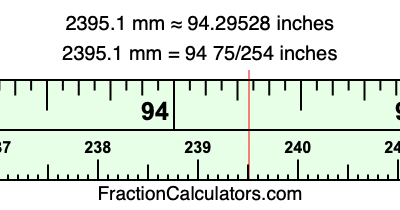 One millimeter is equal to 5/127 inches, and 2395.1 as a fraction is 23951/10. Therefore, to get the fractional answer to 2395.1 mm in inches, we multiply 23951/10 by 5/127 and simplify if necessary.