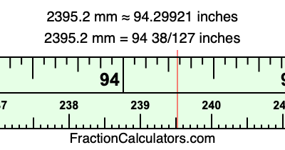 One millimeter is equal to 5/127 inches, and 2395.2 as a fraction is 11976/5. Therefore, to get the fractional answer to 2395.2 mm in inches, we multiply 11976/5 by 5/127 and simplify if necessary.