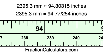 One millimeter is equal to 5/127 inches, and 2395.3 as a fraction is 23953/10. Therefore, to get the fractional answer to 2395.3 mm in inches, we multiply 23953/10 by 5/127 and simplify if necessary.