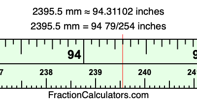 One millimeter is equal to 5/127 inches, and 2395.5 as a fraction is 4791/2. Therefore, to get the fractional answer to 2395.5 mm in inches, we multiply 4791/2 by 5/127 and simplify if necessary.