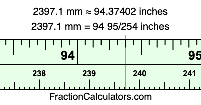 One millimeter is equal to 5/127 inches, and 2397.1 as a fraction is 23971/10. Therefore, to get the fractional answer to 2397.1 mm in inches, we multiply 23971/10 by 5/127 and simplify if necessary.