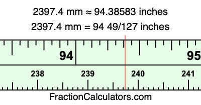 Here is how to convert 2397.4 mm to inches. We will give you the fractional answer, the decimal answer, and illustrate the answer on our tape measure.