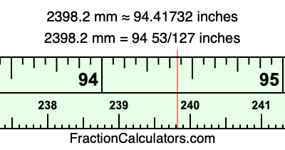 One millimeter is equal to 5/127 inches, and 2398.2 as a fraction is 11991/5. Therefore, to get the fractional answer to 2398.2 mm in inches, we multiply 11991/5 by 5/127 and simplify if necessary.
