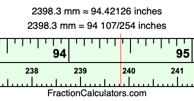 One millimeter is equal to 5/127 inches, and 2398.3 as a fraction is 23983/10. Therefore, to get the fractional answer to 2398.3 mm in inches, we multiply 23983/10 by 5/127 and simplify if necessary.