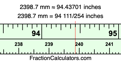 One millimeter is equal to 5/127 inches, and 2398.7 as a fraction is 23987/10. Therefore, to get the fractional answer to 2398.7 mm in inches, we multiply 23987/10 by 5/127 and simplify if necessary.