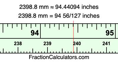 One millimeter is equal to 5/127 inches, and 2398.8 as a fraction is 11994/5. Therefore, to get the fractional answer to 2398.8 mm in inches, we multiply 11994/5 by 5/127 and simplify if necessary.