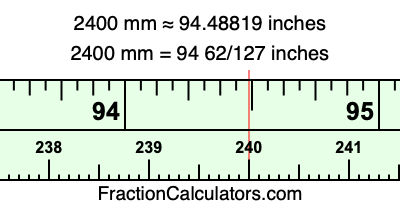 One millimeter is equal to 5/127 inches, and 2400 as a fraction is 2400/1. Therefore, to get the fractional answer to 2400 mm in inches, we multiply 2400/1 by 5/127 and simplify if necessary.