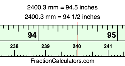 Here is how to convert 2400.3 mm to inches. We will give you the fractional answer, the decimal answer, and illustrate the answer on our tape measure.