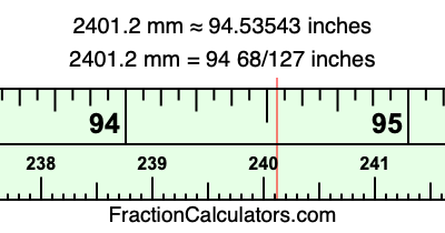 One millimeter is equal to 5/127 inches, and 2401.2 as a fraction is 12006/5. Therefore, to get the fractional answer to 2401.2 mm in inches, we multiply 12006/5 by 5/127 and simplify if necessary.