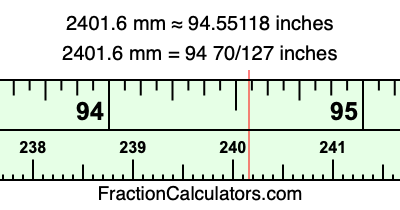 One millimeter is equal to 5/127 inches, and 2401.6 as a fraction is 12008/5. Therefore, to get the fractional answer to 2401.6 mm in inches, we multiply 12008/5 by 5/127 and simplify if necessary.