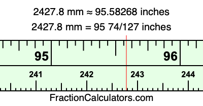 One millimeter is equal to 5/127 inches, and 2427.8 as a fraction is 12139/5. Therefore, to get the fractional answer to 2427.8 mm in inches, we multiply 12139/5 by 5/127 and simplify if necessary.