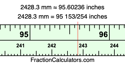 One millimeter is equal to 5/127 inches, and 2428.3 as a fraction is 24283/10. Therefore, to get the fractional answer to 2428.3 mm in inches, we multiply 24283/10 by 5/127 and simplify if necessary.
