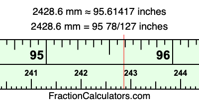 One millimeter is equal to 5/127 inches, and 2428.6 as a fraction is 12143/5. Therefore, to get the fractional answer to 2428.6 mm in inches, we multiply 12143/5 by 5/127 and simplify if necessary.