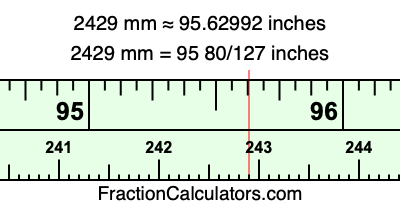 One millimeter is equal to 5/127 inches, and 2429 as a fraction is 2429/1. Therefore, to get the fractional answer to 2429 mm in inches, we multiply 2429/1 by 5/127 and simplify if necessary.