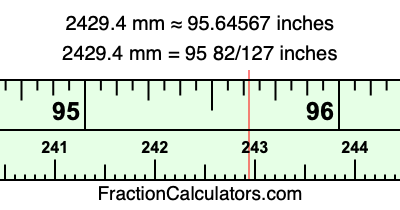 One millimeter is equal to 5/127 inches, and 2429.4 as a fraction is 12147/5. Therefore, to get the fractional answer to 2429.4 mm in inches, we multiply 12147/5 by 5/127 and simplify if necessary.