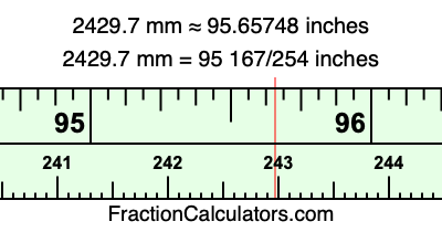 One millimeter is equal to 5/127 inches, and 2429.7 as a fraction is 24297/10. Therefore, to get the fractional answer to 2429.7 mm in inches, we multiply 24297/10 by 5/127 and simplify if necessary.