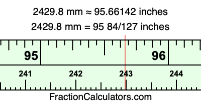 One millimeter is equal to 5/127 inches, and 2429.8 as a fraction is 12149/5. Therefore, to get the fractional answer to 2429.8 mm in inches, we multiply 12149/5 by 5/127 and simplify if necessary.