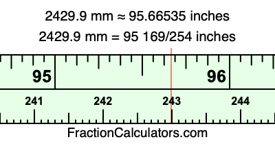 One millimeter is equal to 5/127 inches, and 2429.9 as a fraction is 24299/10. Therefore, to get the fractional answer to 2429.9 mm in inches, we multiply 24299/10 by 5/127 and simplify if necessary.