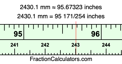 One millimeter is equal to 5/127 inches, and 2430.1 as a fraction is 24301/10. Therefore, to get the fractional answer to 2430.1 mm in inches, we multiply 24301/10 by 5/127 and simplify if necessary.