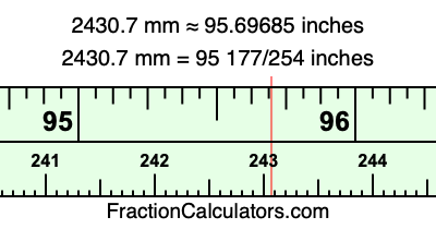One millimeter is equal to 5/127 inches, and 2430.7 as a fraction is 24307/10. Therefore, to get the fractional answer to 2430.7 mm in inches, we multiply 24307/10 by 5/127 and simplify if necessary.