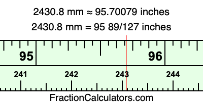 One millimeter is equal to 5/127 inches, and 2430.8 as a fraction is 12154/5. Therefore, to get the fractional answer to 2430.8 mm in inches, we multiply 12154/5 by 5/127 and simplify if necessary.