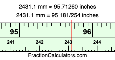 One millimeter is equal to 5/127 inches, and 2431.1 as a fraction is 24311/10. Therefore, to get the fractional answer to 2431.1 mm in inches, we multiply 24311/10 by 5/127 and simplify if necessary.