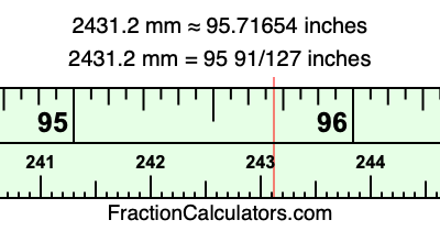 One millimeter is equal to 5/127 inches, and 2431.2 as a fraction is 12156/5. Therefore, to get the fractional answer to 2431.2 mm in inches, we multiply 12156/5 by 5/127 and simplify if necessary.