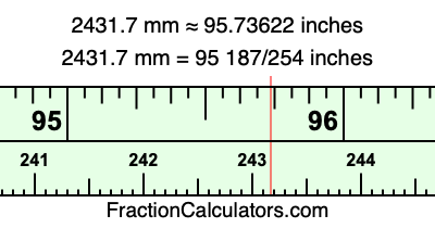 One millimeter is equal to 5/127 inches, and 2431.7 as a fraction is 24317/10. Therefore, to get the fractional answer to 2431.7 mm in inches, we multiply 24317/10 by 5/127 and simplify if necessary.