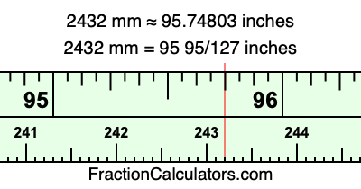 One millimeter is equal to 5/127 inches, and 2432 as a fraction is 2432/1. Therefore, to get the fractional answer to 2432 mm in inches, we multiply 2432/1 by 5/127 and simplify if necessary.