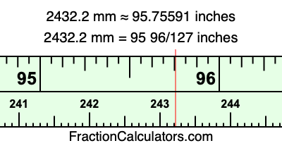 One millimeter is equal to 5/127 inches, and 2432.2 as a fraction is 12161/5. Therefore, to get the fractional answer to 2432.2 mm in inches, we multiply 12161/5 by 5/127 and simplify if necessary.