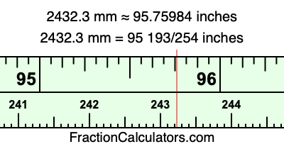 One millimeter is equal to 5/127 inches, and 2432.3 as a fraction is 24323/10. Therefore, to get the fractional answer to 2432.3 mm in inches, we multiply 24323/10 by 5/127 and simplify if necessary.