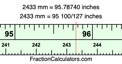 One millimeter is equal to 5/127 inches, and 2433 as a fraction is 2433/1. Therefore, to get the fractional answer to 2433 mm in inches, we multiply 2433/1 by 5/127 and simplify if necessary.
