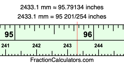 One millimeter is equal to 5/127 inches, and 2433.1 as a fraction is 24331/10. Therefore, to get the fractional answer to 2433.1 mm in inches, we multiply 24331/10 by 5/127 and simplify if necessary.