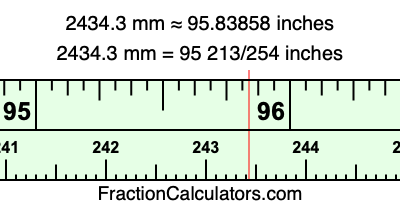 One millimeter is equal to 5/127 inches, and 2434.3 as a fraction is 24343/10. Therefore, to get the fractional answer to 2434.3 mm in inches, we multiply 24343/10 by 5/127 and simplify if necessary.