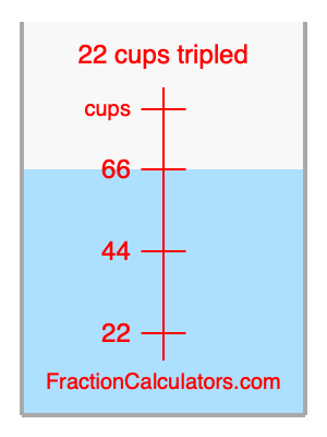 Here we will calculate 22 cups tripled and illustrate 22 cups tripled on a measuring cup. What is 22 cups tripled? 22 cups tripled is 22 cups times three. Therefore, to triple 22 cups, we multiply 22 by 3. Here is the formula, the math, and the answer to 22 cups tripled: