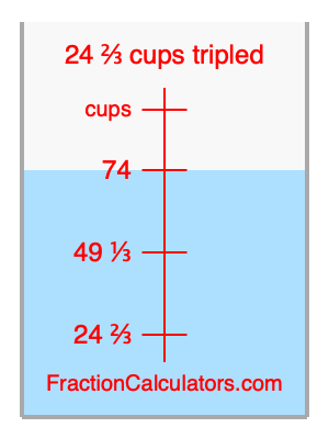 Here we will calculate 24 2/3 cups tripled and illustrate 24 2/3 cups tripled on a measuring cup. What is 24 2/3 cups tripled? 24 2/3 cups tripled is 24 2/3 cups times three. Therefore, to triple 24 2/3 cups, we multiply 24 2/3 by 3. Here is the formula, the math, and the answer to 24 2/3 cups tripled: