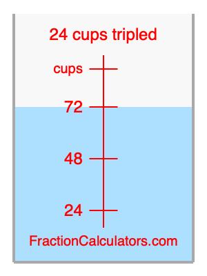 Here we will calculate 24 cups tripled and illustrate 24 cups tripled on a measuring cup. What is 24 cups tripled? 24 cups tripled is 24 cups times three. Therefore, to triple 24 cups, we multiply 24 by 3. Here is the formula, the math, and the answer to 24 cups tripled: