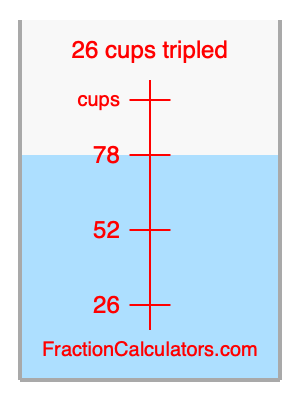 Here we will calculate 26 cups tripled and illustrate 26 cups tripled on a measuring cup. What is 26 cups tripled? 26 cups tripled is 26 cups times three. Therefore, to triple 26 cups, we multiply 26 by 3. Here is the formula, the math, and the answer to 26 cups tripled: